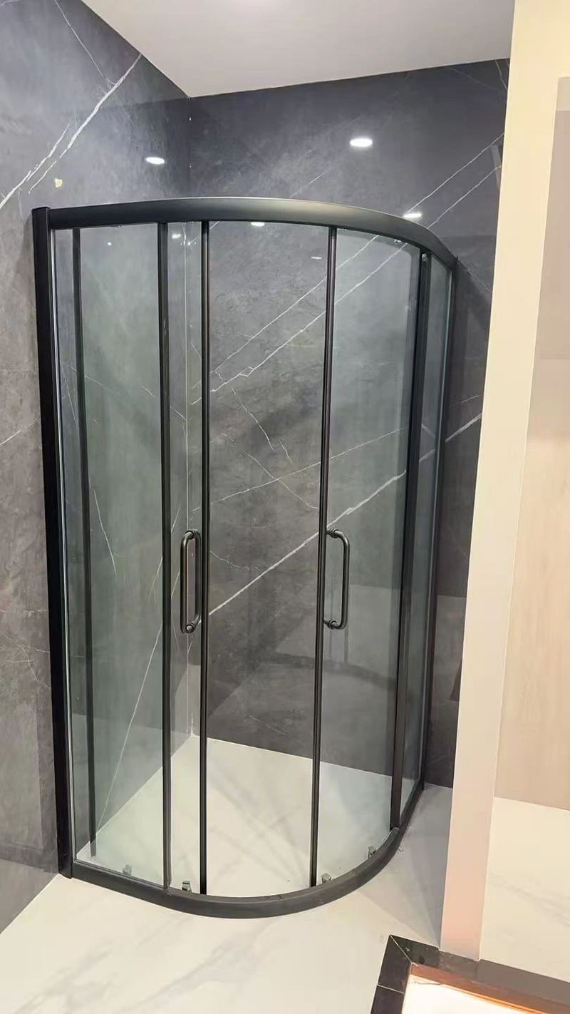 Smooth curves. Seamless elegance. Our custom curved glass door adds a touch of luxury to this bathroom. Precision installation, stunning results.